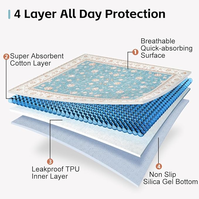 - Leak-Proof in 4 Secs: Rapid-dry top layer + waterproof middle membrane block leaks for long time,sand non-slip rubber baseafeguards floors/car seats/couches.