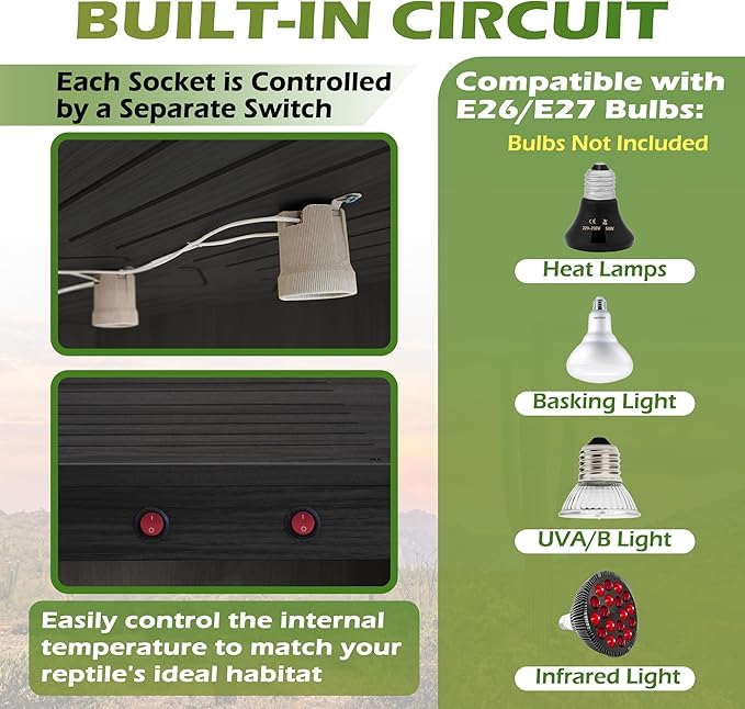- 【Built-In Lighting System】The integrated electrical system includes built-in lamp holders—2 holders for 24"/32" models and 3 for 40"/48" models—each equipped with its own independent switch, saves money setting up the light fixture. Compatible with standard E26/E27 bulbs (not included), this setup gives you full control over lighting and temperature to create the perfect environment for your reptile's specific needs, and say goodbye to tangled wires, one wire control the whole cage.