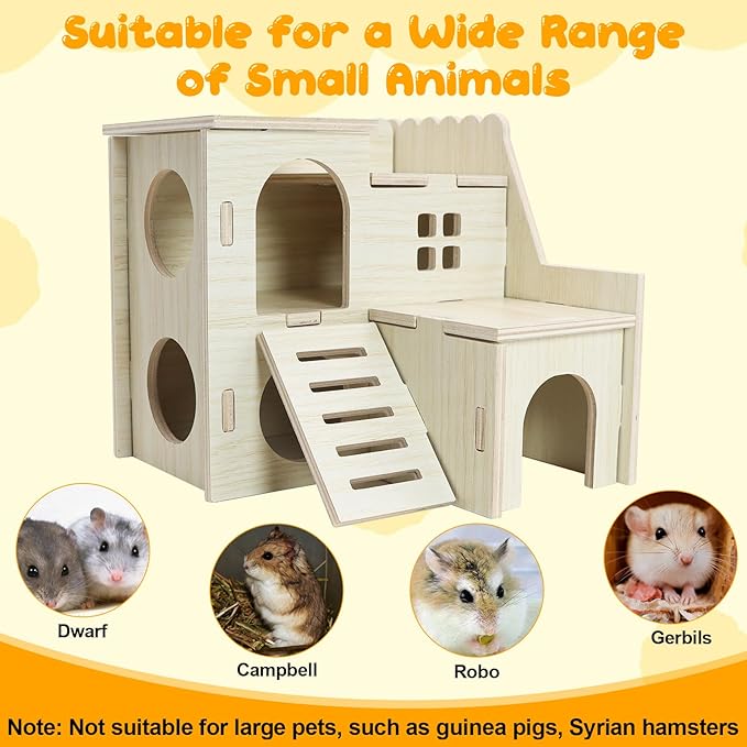 - 【Applicable Scope】The wooden hamster house is suitable for dwarf hamsters, hamsters, and other small pets. Not suitable for large pets such as adult mice, chinchillas or guinea pigs as this wooden house is a bit small for them.