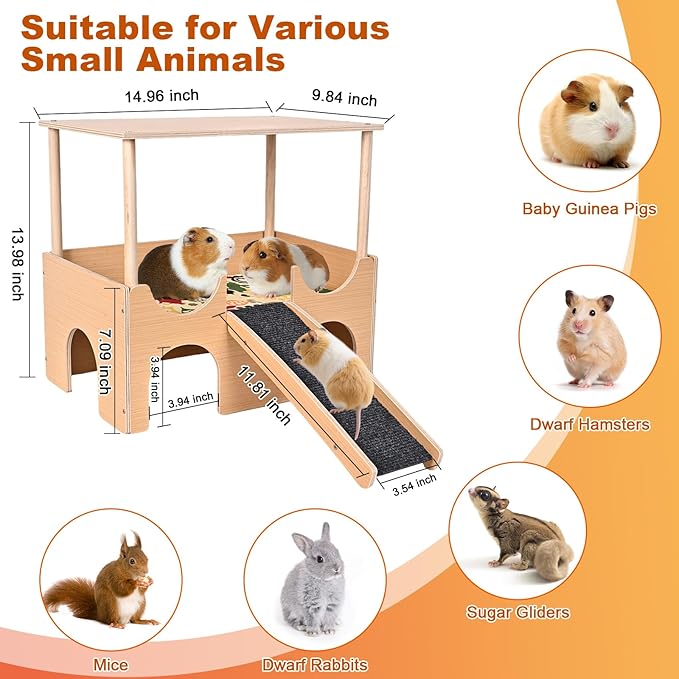 - 【Spacious Space for Small Pets】With dimensions of 15" x 9.8" x 14" when fully assembled, this two-layer guinea pig hideout is ideal for baby guinea pigs, dwarf hamsters, dwarf rabbits, sugar gliders, mice and other small animals to enjoy.