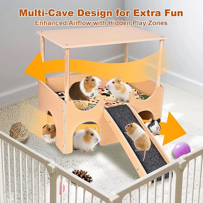 - 【Multi-Cave Design】Crafted with guinea pig's natural behaviors in mind, our wooden habitat features multiple cozy hideaways. These carefully designed caves provide secure play zones while improving air circulation, creating an optimally comfortable environment for natural exploratory behavior.