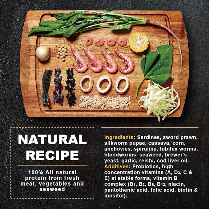 - High Palatability : Sword Prawn Flavor - A blend of wild sword prawns, Sardines, anchovies, vegetables and seaweed. Premium formula which enhanced with bloodworms to double the nutrition. Even the pickiest goldfish can’t resist.