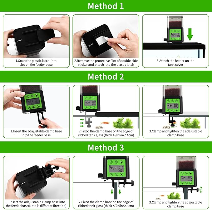 - 【3 Sizes Precise Feeding & 3 Fixing Methods】 This food dispenser for fish tank has 3 different sizes of fish food dischargers, portion sizes can be adjusted to suit the different needs of fish/turtle/koi/goldfish/betta. 3 Installation methods fit for various types of tanks