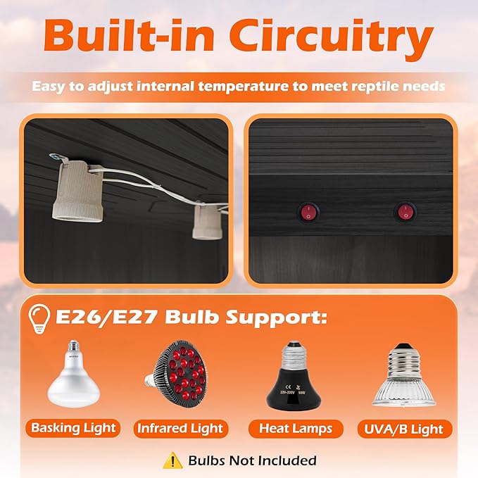 - 【Integrated Lighting System】The built-in electrical setup comes with lamp holders—2 for the 24"/32" sizes and 3 for the 40"/48" sizes—each with its own switch. This cost-effective system eliminates the need for extra fixtures and messy wiring. Compatible with standard E26/E27 bulbs (not included), it allows you to control heat and light with ease, creating the ideal habitat for your reptile’s unique needs.