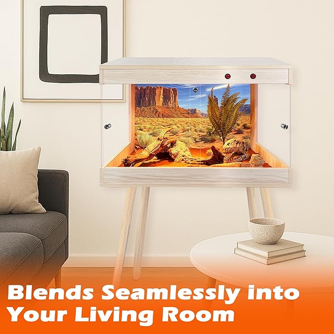 - 【Premium Craftsmanship & Materials】Built with natural wood and strong tempered glass, this reptile terrarium combines strength with a sleek, modern look. The interior is coated with a water-resistant finish for long-lasting use, while the acrylic bottom panel ensures dependable moisture protection against spills and substrate buildup. Its roomy design provides ample space for your reptile to climb, bask, and hide—encouraging natural activity and supporting overall well-being. Available in 4 sizes, each enclosure comes with 4 sturdy legs (see image 2 for detailed dimensions).