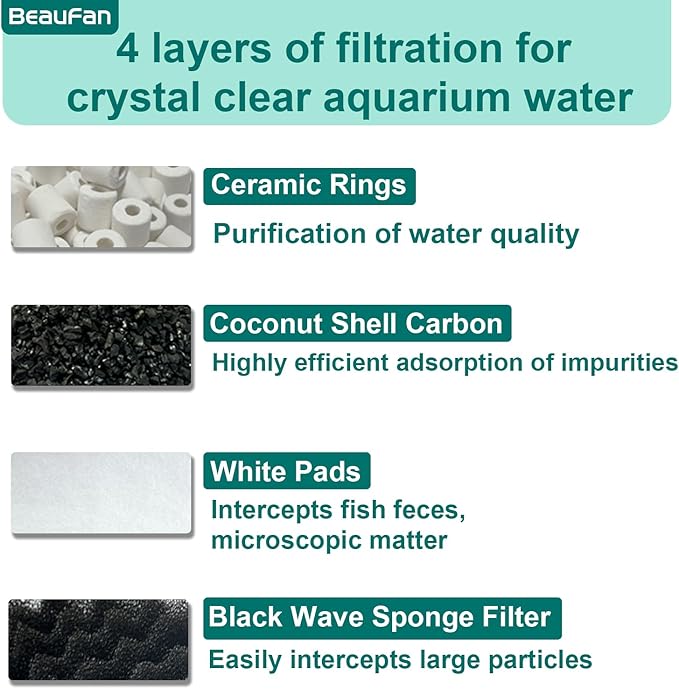 - Enhanced Filtration: The corrugated foam filter traps dirt and debris, maintains even water flow. Activated carbon removes odors, discoloration and impurities for better water transparency. Porous ceramic rings aid filtration, and polishing pads capture floating particles to make water crystal clear