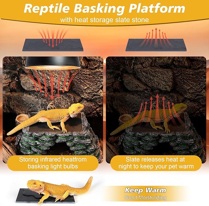 - [3 in 1 Basking Platform] Bearded Dragon Basking Platform size is 13.4x7.1x5.3 inch with Tortoise slate is made of slate stone material with natural texture on the surface and simulating nature tree hole bowl.Rock formations are a naturalistic decorative design. Maximize the simulation of reptiles natural habitats, in line with their wild climbing habits. Suitable for reptiles such as bearded dragon, gecko, lizards, etc.
