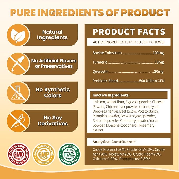 - Triple-action Allergy Support for Cat - Formulated with colostrum, quercetin, turmeric and 500 million CFU of probiotics, these cat tasty chews offer natural allergy relief while supporting the natural body system and seasonal allergy defense.