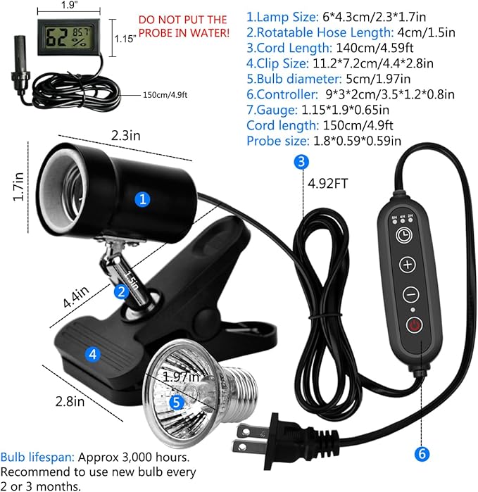 - 【Bulb Life Pro Tips】 Ceramic E27 socket, compatible with 10-75W fluorescent, incandescent, ceramic heater, UV bulb, halogen, LED, etc. ▶️Suggestion: Use new bulb every 2 months in a high temperature environment. Avoid placing it with plastic. 【Package】 Includes 1 * Heat Lamp , 1 * 50W E27 socket Bulb (3000+ hours life certification),1 * gauge. Cord length approx 4.59 FT. Clip opening up to 1.97 inch.