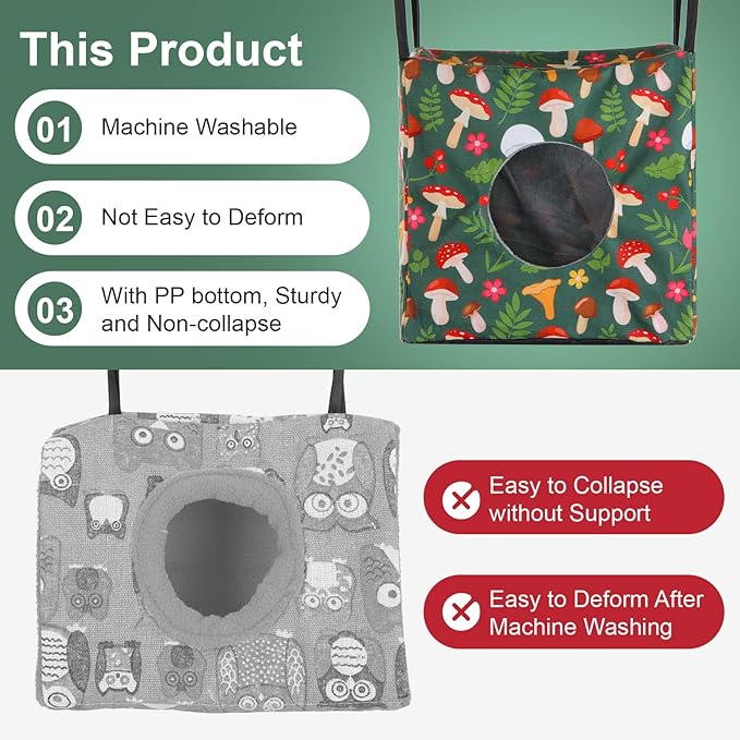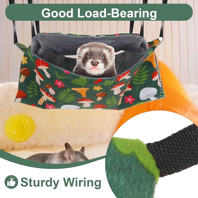 - Complete 4-Piece Set: This versatile ferret hammock for cage includes four different style hammocks in adorable mushroom patterns - a square nest, hanging bed, tunnel hideout, and flat blanket. Perfect ferret hammocks set provides multiple resting and playing options for your small pets, keeping them entertained and comfortable throughout the day.