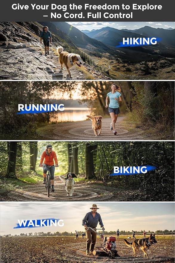 - 🐕🦺𝐒𝐚𝐟𝐞𝐭𝐲 𝐋𝐨𝐜𝐤 𝐚𝐧𝐝 𝐓𝐫𝐢𝐩𝐥𝐞 𝐖𝐢𝐫𝐞𝐥𝐞𝐬𝐬 𝐓𝐞𝐜𝐡𝐧𝐨𝐥𝐨𝐠𝐲 – The wireless dog fence system keeps your pup safe with our powerful electronic wireless fence, featuring a built-in safety lock and adjustable distance from 30 ft to 3500 ft. The receiver delivers vibration or static correction, while the transmitter beeps instantly if your dog crosses the limit. It's your go-anywhere wireless leash.