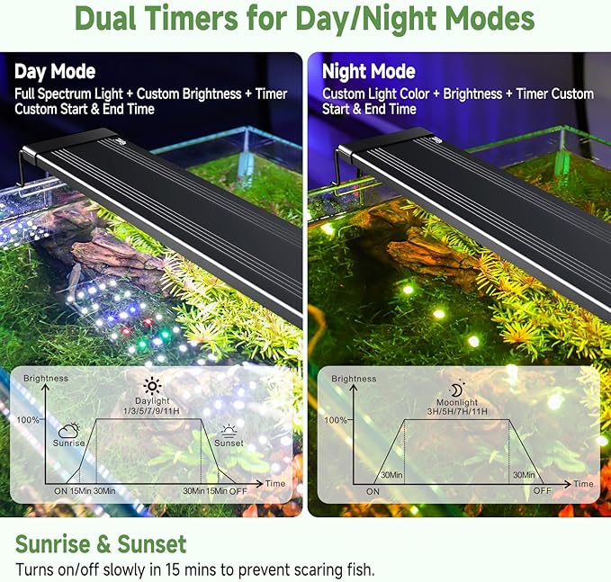- 【Dual Mode Pre-programmed Day-L and Moon-L】① Color Cycling: 10 colors + 5 brightness levels (10%–100%) ② Moon-L: Custom color & 4H/6H/8H/12H timer for nocturnal viewing ③ Day-L: Automated daylight cycle with 2H/4H/6H/8H/10H/12H programmable timer and 15-min gradual transition to prevent sudden light changes. The light turns on and off slowly over a 15 minute period so it won’t spook your fish.