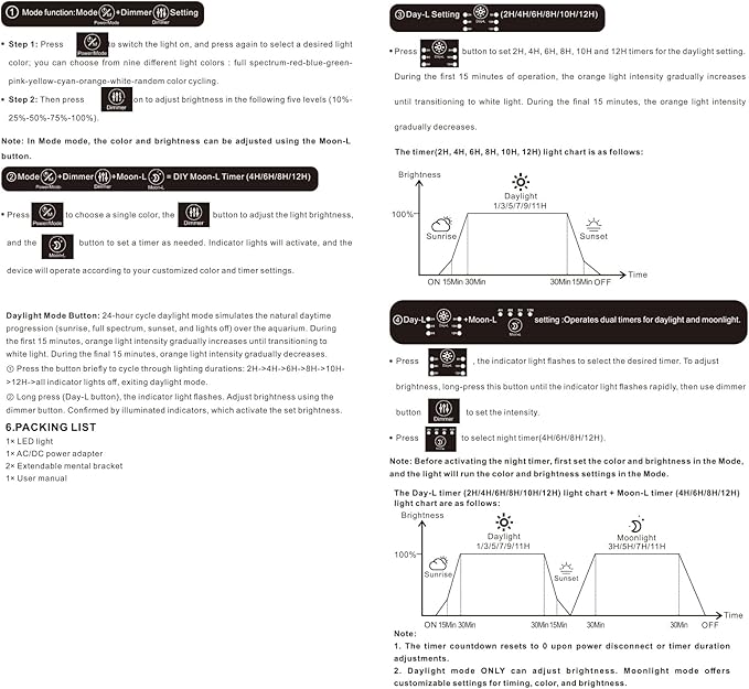 - 【Dual Mode Pre-programmed Day-L and Moon-L】① Color Cycling: 10 colors + 5 brightness levels (10%–100%) ② Moon-L: Custom color & 4H/6H/8H/12H timer for nocturnal viewing ③ Day-L: Automated daylight cycle with 2H/4H/6H/8H/10H/12H programmable timer and 15-min gradual transition to prevent sudden light changes. The light turns on and off slowly over a 15 minute period so it won’t spook your fish.