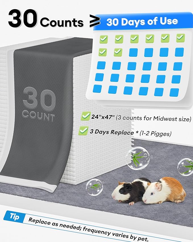 - ๐๐๐ ๐๐จ๐ฎ๐ง๐ญ๐ฌ & ๐ ๐๐จ๐ง๐ญ๐ก ๐๐ฎ๐ฉ๐ฉ๐ฅ๐ฒ - Each package consists of 30 counts of disposable pee pads. With the use of 3 pads per change, a 30-pad pack provides about one month of convenient, low-mess care. We recommend replacing liners every 3 days for guinea pigs.