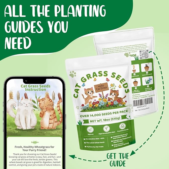 - Complete Planting Guide: You can scan the QR code on the packaging to access the full cat grass planting guide. Just follow the instructions, and you'll easily grow fresh & green cat grass. Even if you're a beginner, there's no need to worry!