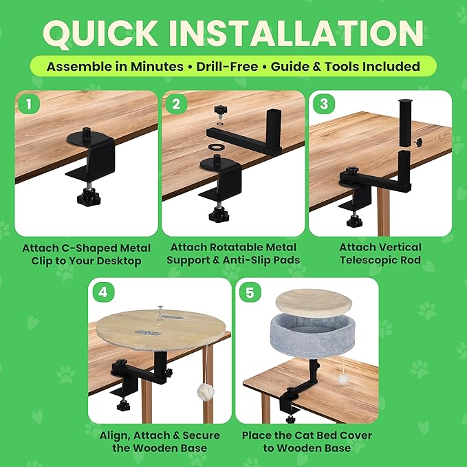- Fits Where You Need: A flexible desk bed for cat clamps tool-free to most desks and kitchen islands. Rotate closer for bonding or swing away for typing, surface-safe pads protect wood and laminate finishes
