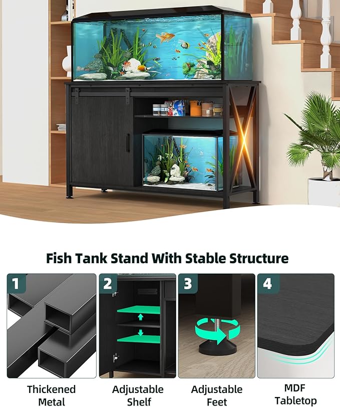 - Stylish & Modern Style : Black metal frame fish tank stand is paired with farmhouse-style sliding barn doors and MDF wood grain texture tabletop, making fish tank with stand suitable for any modern, industrial, or rustic decor; Ideal for fish tanks, turtle enclosures, or reptile terrariums in the living room, bedroom, or office