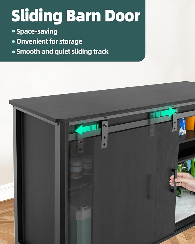 - Stylish & Modern Style : Black metal frame fish tank stand is paired with farmhouse-style sliding barn doors and MDF wood grain texture tabletop, making fish tank with stand suitable for any modern, industrial, or rustic decor; Ideal for fish tanks, turtle enclosures, or reptile terrariums in the living room, bedroom, or office