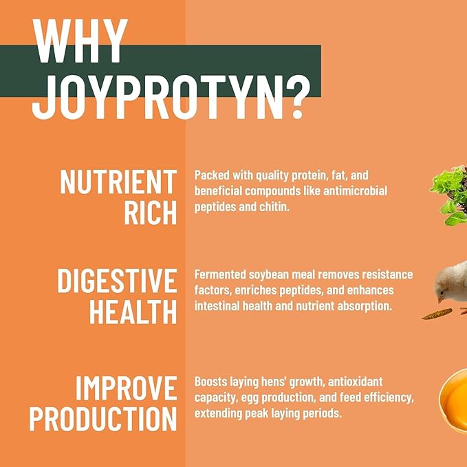 - Worry-Free After-Sales Service: At Joyprotyn, your satisfaction is our priority. Each 30LB bag provides ample supply for your flock, and if you’re not fully satisfied with our premium BSFL feed, our dedicated customer service team is here to ensure a solution. Enjoy peace of mind with Joyprotyn’s high-quality, nutritious feed for worry-free feeding.