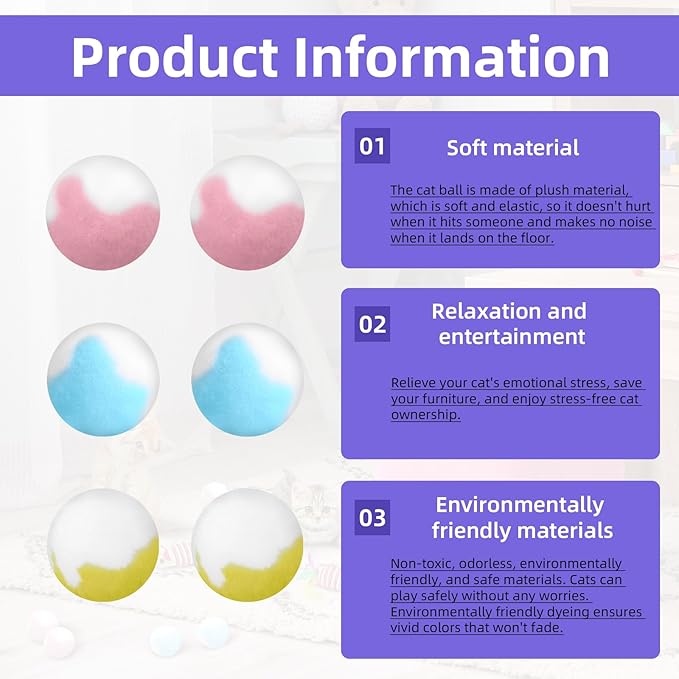 - Soft Marerlal: Our cat pom pom balls are made of plush material,soft and elastic,no pain when bumped into people, and landing noiselessly,won't disturb others