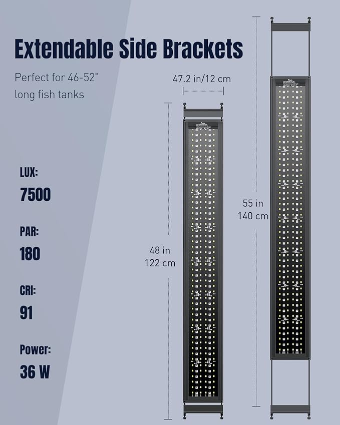 - For 46"-52" Tanks: Extendable side brackets (48-55" length) fit tanks of 46-52" long. Adjustable screws on each bracket let you set the perfect height for your aquarium. Handy top holes make hanging easy with compatible tank hooks or mounting accessories