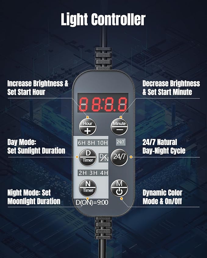 - Customizable Day & Night Mode: Customize daytime (6/8/10 h) and night hours (2/3/4 h) to simulate sunlight and moonlight, revitalizing your aquarium and mimicking natural light patterns. Suitable for freshwater, saltwater, planted, and coral reef tanks