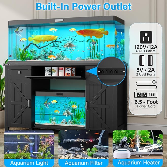 Farmhouse 55-75 Gallon Fish Tank Stand with Power Outlet, Aquarium Stand with 2 Drawers and Adjustable Shelves, Heavy Duty Reptile Tank Stand for 2 Fish Tank/Turtle Tank/Reptile Terrarium