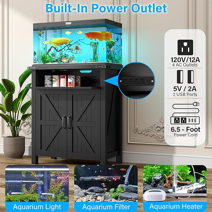 20 Gallon Fish Tank Stand with Power Outlets, Farmhouse Decorative Aquarium Stand Furniture with Adjustable Shelves, 10-20 Gallon Reptile Turtle Tank Stand with Cabinet Storage (Black, 20GL)