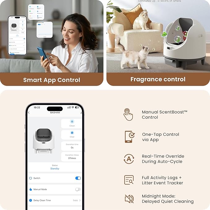 Bashaw Self Cleaning Litter Box, Automatic Cat Litter Box for Multiple Cats, App Control with Safety Sensors, Open Top, Includes Scent Cartridge & Trash Bags