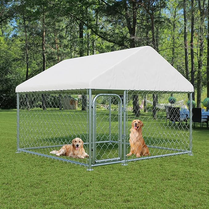 LotFun Large Outdoor Dog Kennel, 10 x 10 FT Heavy Duty Dog Enclosure with Chain Link Fence, UV-Resistant Canopy Cover, Double Lock Security (6 x 6 x 5 in)
