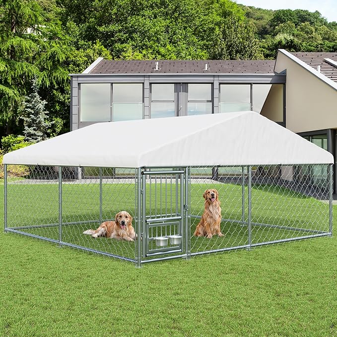 LotFun Large Outdoor Dog Kennel, 10 x 10 FT Heavy Duty Dog Enclosure with Rotated Dog Bowls, UV-Resistant Canopy Cover, Double Lock Security (10 x 10 x 5 in)