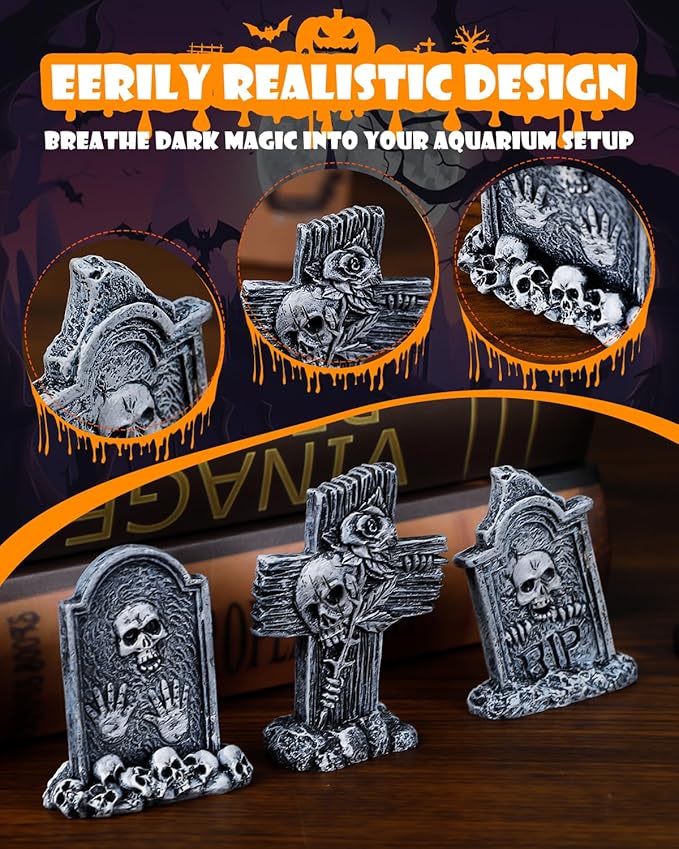 - 3-Piece Set: Transform your aquarium into a spooky underwater graveyard! The mini tombstones figurines present refined carved details, spreading creepy Halloween vibes throughout your tank. Just place them thoughtfully for maximum bone-chilling impact