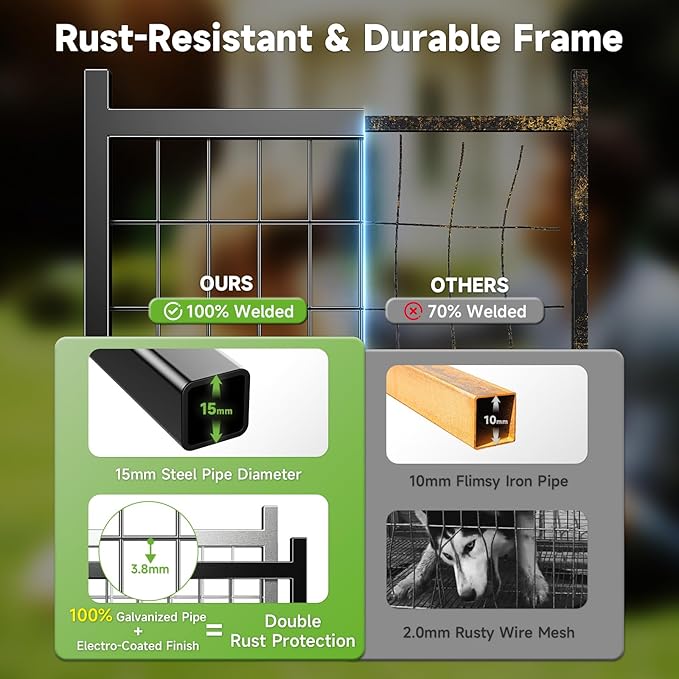 - 【Rust-Resistant Sturdy Metal Frame】Built with 15mm galvanized steel tubes and 3.8mm fully welded wire mesh, our outdoor dog kennels offer exceptional strength. The upgraded clip system locks panels tightly together to prevent shifting, keeping the structure solid and stable. Finished with black electrophoretic coating, the frame has double rust protection, corrosion-resistant, and fade-resistant. Designed to withstand all outdoor weather conditions, sturdy and durable.
