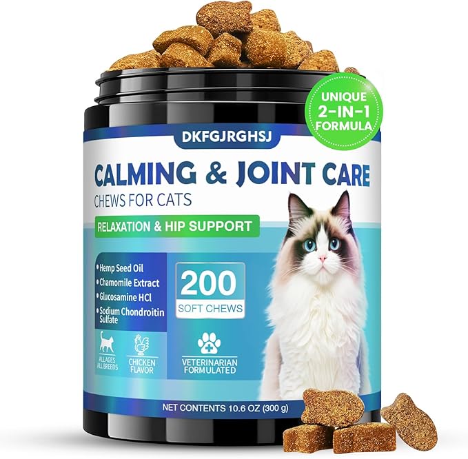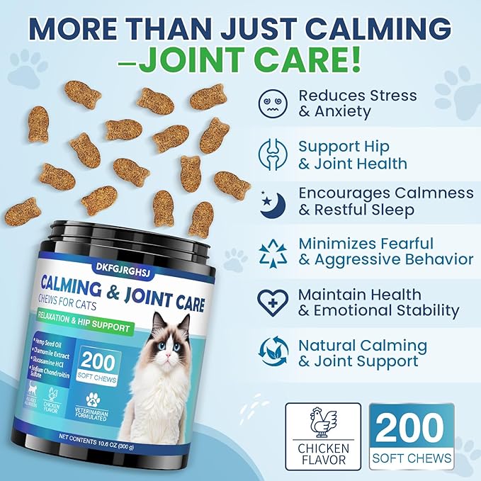 - Delicious Chicken Flavored: These tempting chicken flavored cat calming treats soothes anxiety while serving as a cat joint supplement. Each bottle contains 200 chews of calming cat treats, perfect for daily use to manage stress and support hip health. Cat calming chews is enriched with chamomile and glucosamine to address anxiety and joint issues at the same time. Joint supplement for cats is a cost-effective solution for comprehensive pet calming and joint health