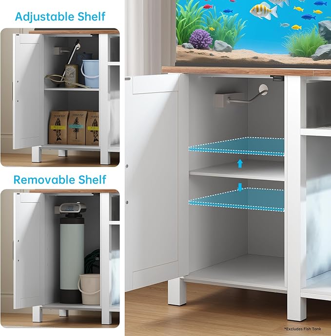 - 【Spacious Storage】This aquarium stand features a storage cabinet with adjustable shelf, providing customizable storage for fish food, filters, and cleaning tools; In addition, the space below of 2-tier stand can accommodate 10-20 gallon fish tanks, making it a versatile option for multi tank setups.