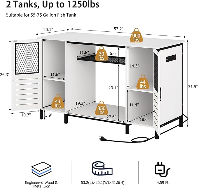- Large Capacity & Stability: Specifically designed for 55 - 75 gallon fish tanks, this white aquarium stand features a heavy-duty metal frame and premium oisture-resistant MDF that can support up to 1250lbs (it can support up to 900 pounds on the tabletop and 350 pounds on the bottom). This ensures your fish tank remains stable and secure, minimizing the risk of tipping and keeping your aquatic pets safe
